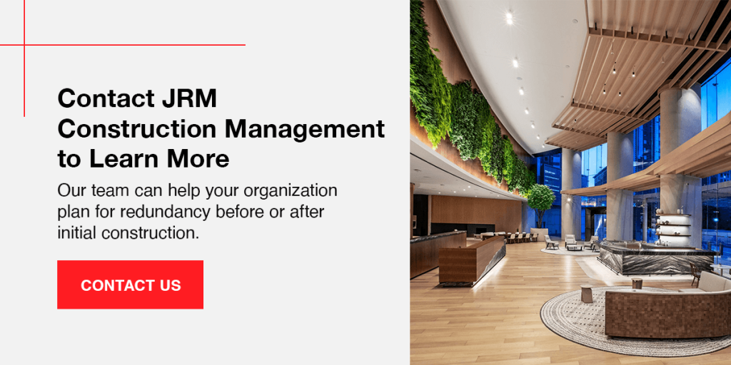 At JRM Construction Management, we strive to build long-lasting partnerships with each of our clients by delivering the highest-performing services on time and within budget, regardless of the size or scope of a construction project. Our team can help your organization plan for redundancy before or after initial construction. Connect with us online today to learn more about mission-critical construction and our other services.